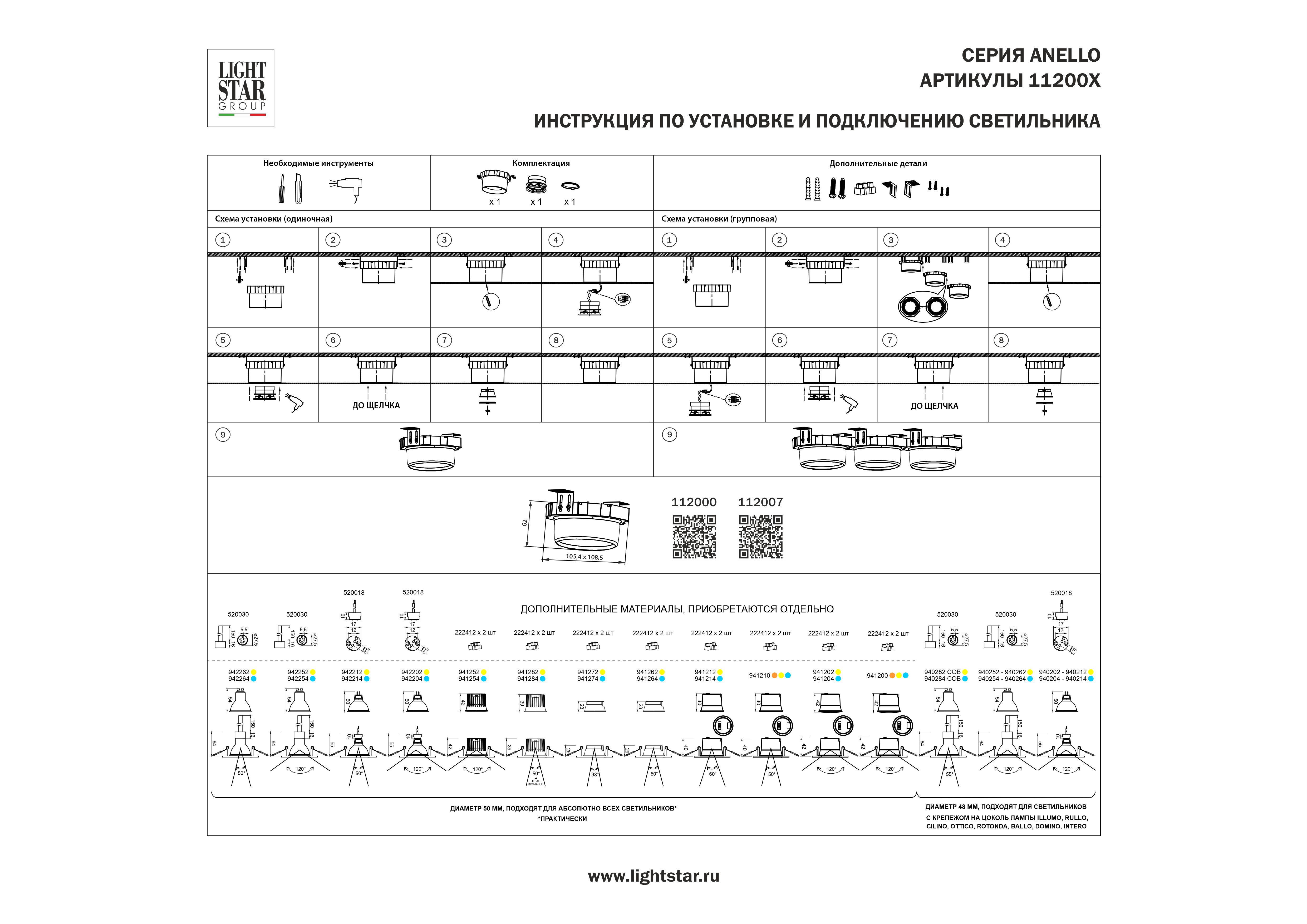 Светильник скрытой установки для натяжного потолка с системой CLICK-CLACK без использования шурупов и винтовпод светодиодный модуль 941ХХХ либо для ламп 9402ХХ и 9422XX (для подключения ламп 9402ХХ и 9422XX необходим патрон GU10 520030 или G5.3 520018), L108,5 W105,4 H62В комплекте: рамка (суппорт) - 1 шт, внутреннее кольцо (вставка под лампу) - 1 шт.Возможны комбинации нескольких светильников в линию с межосевым расстоянием 108,5 мм